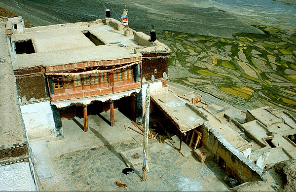 - «В [Карше] был построен на скалистом склоне холма напротив белого форта, с глубоко-посаженными, чёрно-краевыми окнами. Издалека деревня, гомпа и гора кажутся слитыми… Это был средневековый мир. Ламы всех возрастов болтали и смеялись, сидя на ступеньках перед массивными железными дверями с железными штифтами. В вечернем солнце углы крыши и квадратные перемычки покрывались чёрно-белыми тенями с геометрическим узором. Мастифы, которые днём лежали укрывшись от жары в тенистых уголках гомпы (рядом) с мусорной кучей — старые кости, куски ткани, и непарные ботинки. Несмотря на жару плащ старого ламы, тёмно-красного цвета был из тяжёлого твида. Дерзкие, бритоголовые мальчики носили хлопковые плащи, снимая их с одного плеча и жёлтыми шапками с лихо завёрнутыми углами. Медвежья шкура висела над входом в главный храм, массивная мрачная голова выше, казалось, в любою минуту готова обнажить клыки