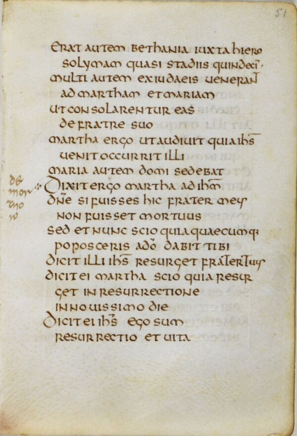 В текстологическом отношении Евангелие включает точную и аккуратную копию Евангелия от Иоанна, относящуюся к итало-нортумбрийской семье (к последней относятся также Линдисфарнское Евангелие и Амиатинский кодекс). Предположительно, текст восходит к так называемому «Неаполитанскому Евангелию», доставленному Адрианом Кентерберийским из миссии Феодора Тарсийского из Нериды, близ Неаполя; такие сведения проводил Беда Достопочтенный. И в Амиатинском кодексе, и в Линдисфарнском Евангелии приводятся праздники местночтимых святых Неаполя, в том числе Святого Януария[3]. Четыре места в тексте (например, на л. 51 Ин. 11:18-25) отмечены на полях, причём отрывки соответствуют заупокойной мессе из Римского лекционария VII века. В указанном примере десятая строка отмечена пометой de mortuorum[4].