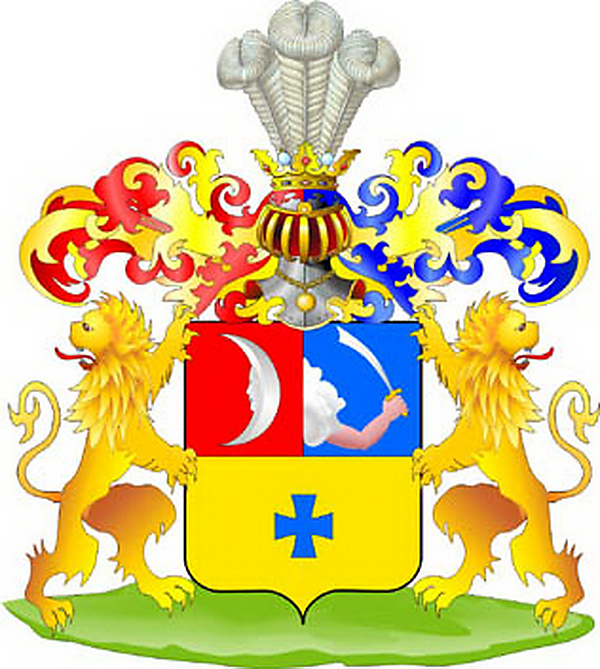 Щит разделён на три части, из коих в первой в красном поле изображена серебряная луна, рогами обращённая в правую сторону; во втором в голубом поле видна выходящая из облаков рука, держащая меч; в третьей части в золотом поле находится голубой крест.