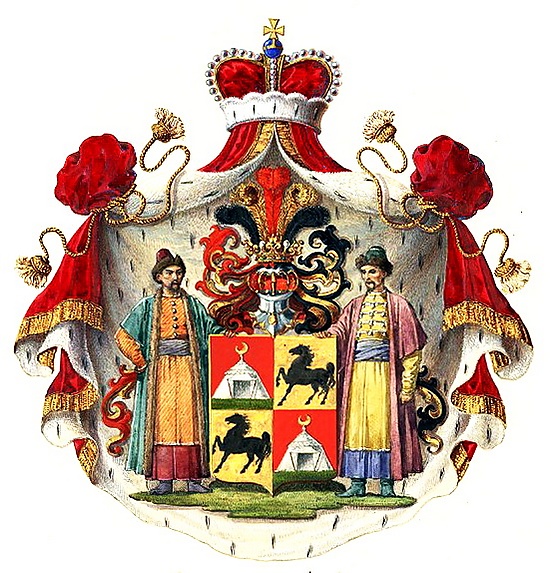 На щите дворянский коронованный шлем. Нашлемник: пять страусовых перьев среднее — червлёное, второе и четвёртое — золотые, крайние — чёрные. Намёт на щите справа червлёный с золотом, слева чёрный с золотом. Щитодержатели: два татарина в своих национальных одеждах. Герб украшен княжеской мантией с княжеской короной.