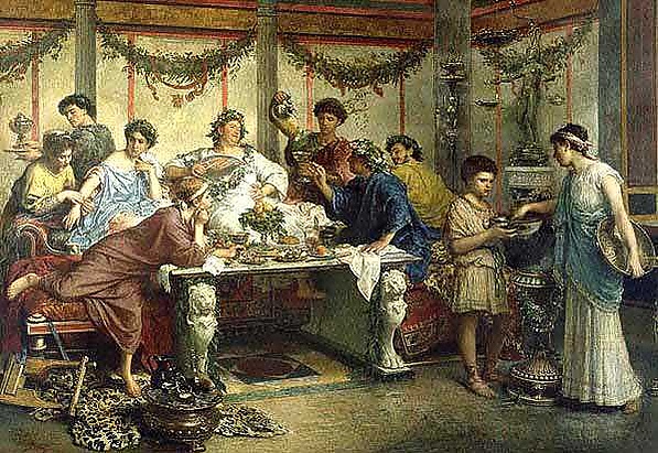 Ужины с друзьями во времена Плиния и Цицерона были важной частью жизни древнеримской аристократии. Банкеты устраивались не только по случаю дня рождения или свадьбы, а скорее входили в распорядок дня наряду с принятием клиентов или посещением форума и терм. По словам Цицерона, для Катона Старшего смысл застолья заключался в общении с друзьями и ведении беседы[81]. На пирах в доме аристократа собирались гости различного положения: родственники, друзья, клиенты, вольноотпущенники, женщины — хозяйка дома, жёны гостей, а также дети, прежде всего сыновья. Обслуживание, место и блюда, которые подносились гостям, строго соответствовали их положению в обществе.