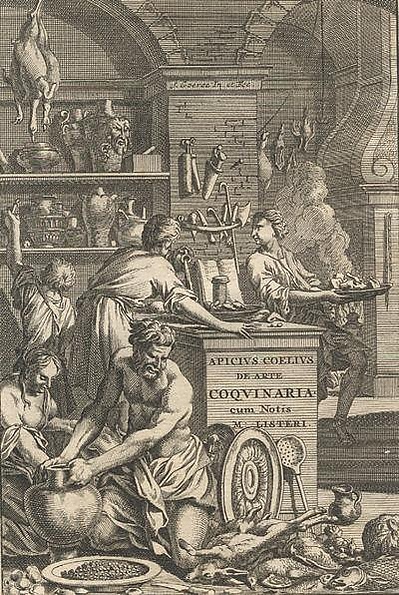 От греков римляне переняли многие техники приготовления пищи, рецепты и названия блюд и кухонной утвари. Часто рецепты назывались по именам поваров или гурманов, которые их приготовили[20]:186, например, «горох а-ля Вителлий», тушёный с мальвой (V, 3, 9), «курица а-ля Гелиогабал» с белым молочным соусом, «гороховая похлёбка а-ля Апиций» с колбасой, свининой, ветчиной (V, 4, 2). В поваренной книге Апиция «Об искусстве приготовления пищи» перечислены блюда, в которых сочетались рецепты и продукты разных регионов мира: тыква по-александрийски с мёдом и зёрнами пинии; ягнёнок, наполненный чабером и дамасскими сливами; страус с двумя сортами фиников и горохом по-индийски с кальмарами и осьминогами, приправленный вином, зелёным луком и кориандром (V, 3, 3).