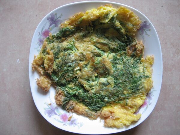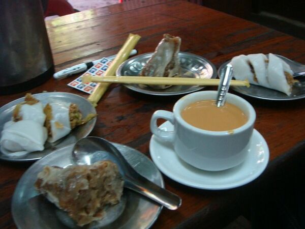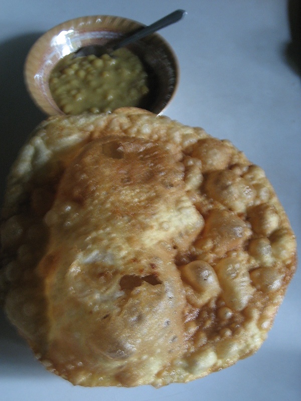 - Жареный чапати, хрустящий и покрытый пузырями, с варёным горошком (pé-byohk), популярный завтрак рядом с nan bya.
