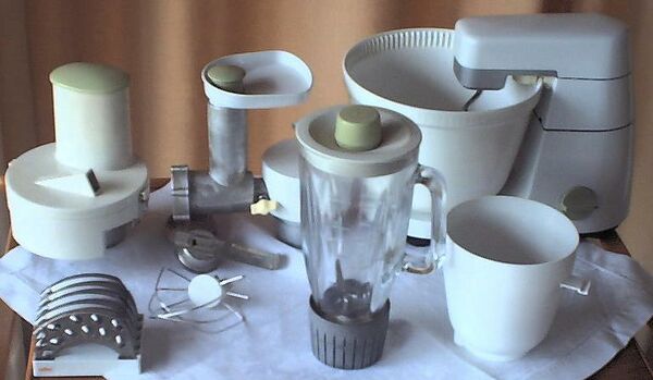 Основными компонентами кухонного комбайна являются моторный блок, рабочая чаша и насадки.