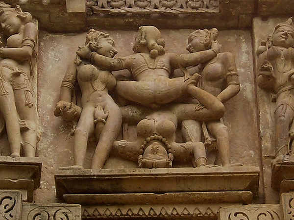 Индологи выдвигают несколько объяснений эротизма ряда скульптурных композиций Кхаджурахо[14]. Во-первых, сексуальная тема могла быть общедоступной в Древней Индии и не являлась предметом табу. В «Хожении за три моря» тверской купец Афанасий Никитин, путешествовавший в средневековую Индию в 1468—1475 годах, отмечал: «А женщины ходят — голова не покрыта, а груди голы, а мальчики и девочки нагие ходят до семи лет, срам не прикрыт» и далее по прибытии в Бидар (Карнатака), «а здесь люди все черные, все злодеи, а женки все гулящие, да колдуны, да тати, да обман, да яд, господ ядом морят»[15]. Во-вторых, скульптуры являются иллюстрациями Камасутры и имеют ритуальный символизм. В соединении йоги (контроля за эмоциями и телом) и бхоги (физического удовольствия) индусы видели путь к достижению освобождения. В-третьих, размещение эротической скульптуры на нижних уровнях храмов имело целью показать место половых отношений в иерархии человеческих ценностей. На верхних уровнях расположены только божества и полубоги. Следует отметить, что в искусстве Древней Индии встречаются более ранние изображения влюблённых пар. К ним относятся терракотовые скульптуры периода Шунга, а также скульптура более позднего периода в городах Амаравати и Матхура. В целом, эротизм храмового комплекса Кхаджурахо нередко преувеличивается. По оценкам индологов, среди скульптур и барельефов, украшающих внешние стены западной группы храмов, эротическими являются не более 2-3 %[6].