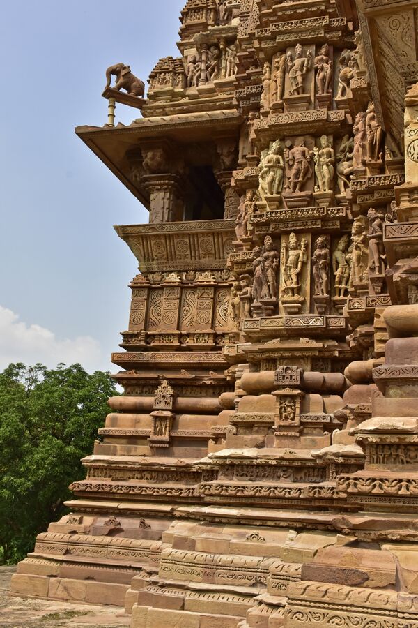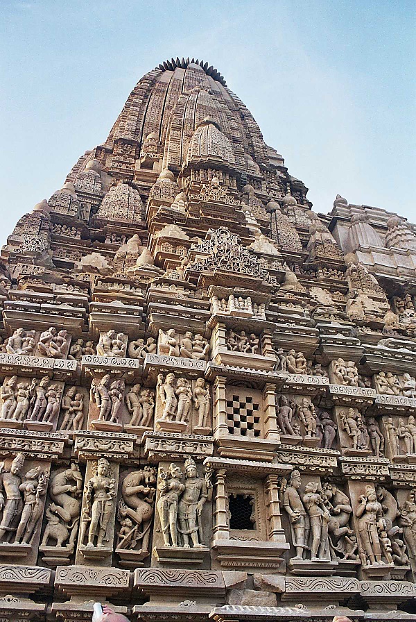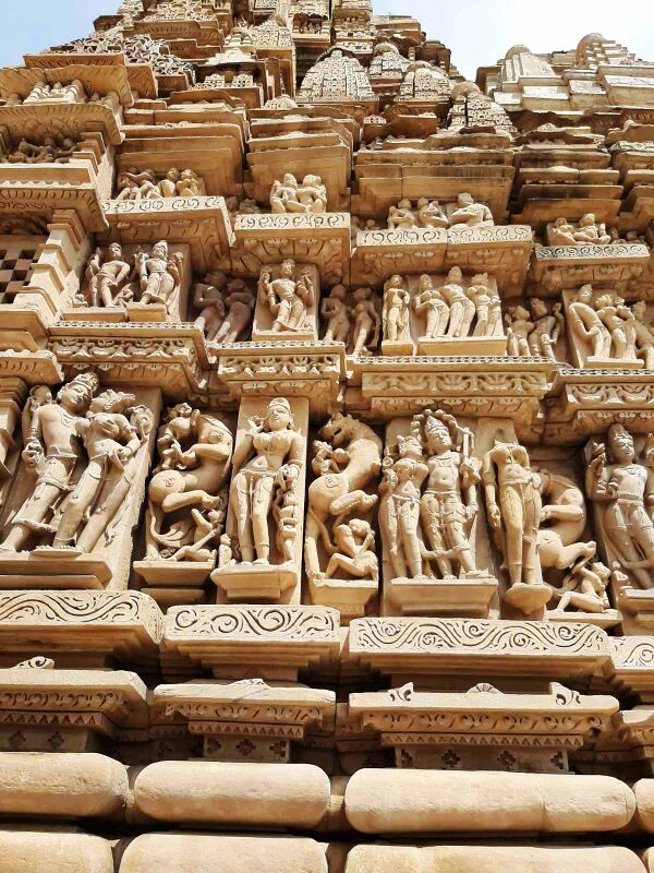 В больших храмах боковые трансепты обладают окнами с балконами для вентиляции. Над балконами размещены роскошные скульптурные группы, которые показывают сцены из жизни богов. Солнечный свет из окон освещает внутренний центральный зал. Схематично храм с двумя парами трансептов вдоль оси похож на латинский крест. Некоторые из больших храмов имеют дополнительные святилища (часовни) по четырём углам платформы. Храмы имеют подчёркнуто высокое основание, платформу-террасу (джагати). По её периметру размещены серии восхитительных орнаментов. Великолепные рельефы сменяют друг друга, как кадры из фильма о жизни династии Чандела. Стены храмов покрыты двумя и более рядами изысканной скульптуры. Совершенная красота проявляется в каждой статуе с её утонченностью, культом изящества и совершенства. Храмовая скульптура является главной притягательной особенностью Кхаджурахо[4].