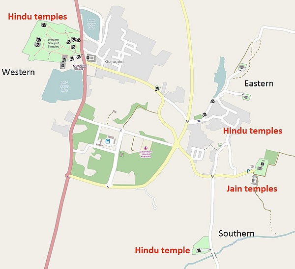 Западная группа состоит из 9 индуистских храмов и только 5 из них представляют наибольший интерес как для туристов, так и для специалистов. Четыре храма джайнов восточной группы исполнены не столь качественно и изысканно. На юге расположено несколько второстепенных храмов, которые посещают, преимущественно, туристы, интересующиеся историей. В целом из 22 храмов главной популярностью пользуются только 5 храмов из западной группы, ежегодно привлекающие тысячи туристов[6].