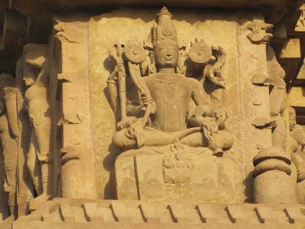 - Скульптуры божества, которому посвящён храм. Встречаются в нишах на стенах, а также в больших и средних барельефах на фасадах храмов и во внутреннем убранстве. Скульптуры в нишах выполнены в соответствии с религиозными канонами, заложенными в Агамах. Божества можно отличить по особым признакам: короне, атрибутам в руках, украшениям (каустубха), ожерельям или гирляндам (ванамала) и браслетам, ездовому животному.