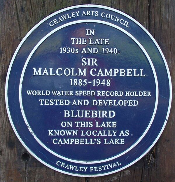 Малкольм Кэмпбелл также разработал и протестировал водную «Синюю птицу» на озере Tilgate в одноимённом парке в городе Кроли (Западный Суссекс). Он четырежды устанавливал рекорд скорости на воде, достигнув 141,740 миль в час (228,108 км/ч) на Blue Bird K4. Последний рекорд был установлен 19 августа 1939 года на озере Конистон-Уотер, графство Камбрия, Англия.[4]