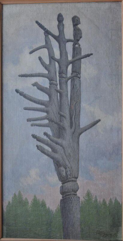 На полотне изображено старое высохшее дерево с причудливо изогнутыми ветвями и тремя стволами, отходящими от его середины. У основания разветвления стволов вырезаны изображения черепа лошади и фигуры человека. Концы большинства ветвей украшены резьбой. В правом нижнем углу помещена авторская монограмма «ИП».