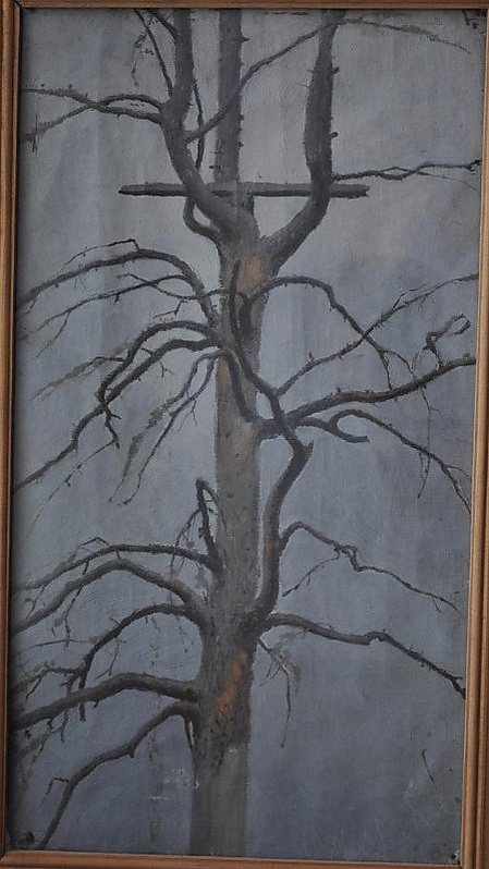 На картине представлен пейзаж, в центре которого изображено старое засохшее дерево с причудливо изогнутыми ветвями. Фон составляет серое небо, что подчёркивает атмосферу и настроение композиции. Работа отличается сдержанной цветовой гаммой, акцентируя внимание на выразительной форме дерева.