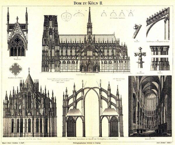В своей основе Кёльнский собор следует композиции прославленных соборов Амьена и Реймса. Но Кёльнский превосходит их размерами: 144 м в длину, 86 м в ширину, высота башен должна была достигнуть 157 м. Формы фундамента, заложенного в 1248 году, также были позаимствованы у новых соборов, появившихся во Франции[1]. Для того чтобы во внутренние помещения проникало больше света, вместо массивных стен были возведены стройные пилястры. А для того, чтобы стены были в состоянии выдержать огромный вес сводов, была применена система внешних контрфорсов и арок — так называемая арочно-контрфорсная система. При этом арки имели не полукруглую, а стрельчатую форму, что позволило равномерно перекрыть ими всю поверхность здания и подчеркнуть устремлённость всей конструкции ввысь к небу. Эта гигантская архитектурная конструкция должна была вызывать у людей благоговение перед Царствием небесным.