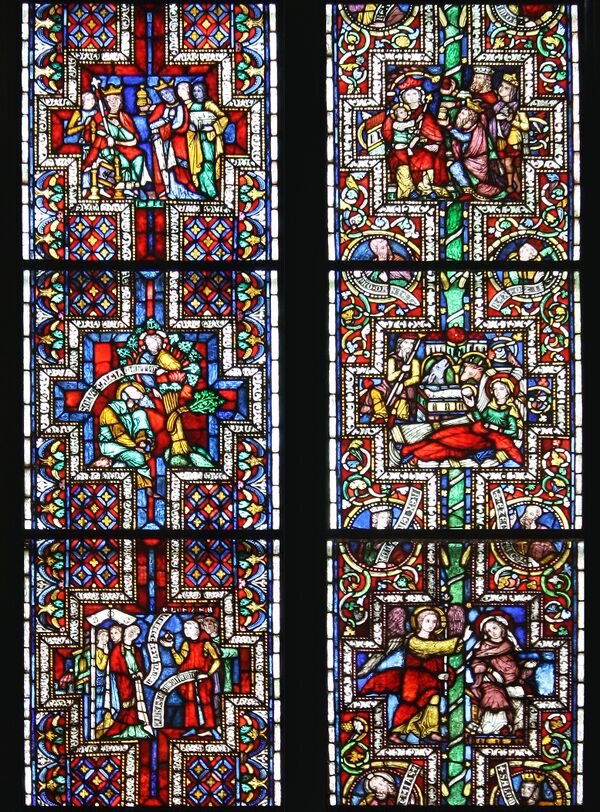 Уникальные витражи Кёльнского собора известны под обобщающим названием «Библейские окна» (нем. Bibelfenster). Основная и наиболее ценная часть создавалась в 1248—1500 годах. Различают «первые окна» (Erstes Bibelfenster), выполненные в 1260 году в капелле «Трёх Святых королей», представляющие двадцать сцен из Ветхого и Нового Заветов, «Вторые окна» (Zweites Bibelfenster, 1280) — двадцать два сюжета в квадрифолиях, в двух узких вытянутых окнах капеллы Святого Стефана в апсиде собора, сохранившиеся от старой, стоявшей на этом месте доминиканской церкви Святого Креста[10]. Третьи, или Младшие окна (Das jungere Bibelfenster), сделаны в 1823—1892 годах в период историзма. При создании новых витражей использовалась средневековая иконография и стилистика[11]. Все витражи выполнены в перегородчатой, или паечной, технике. Они характерны сочной гаммой ярких красных, синих, зелёных и жёлтых стёкол с чёрным рисующим контуром свинцовых перемычек. Мелкие детали фигур, лиц и драпировок прорисованы чёрной краской — шварцлотом[12].