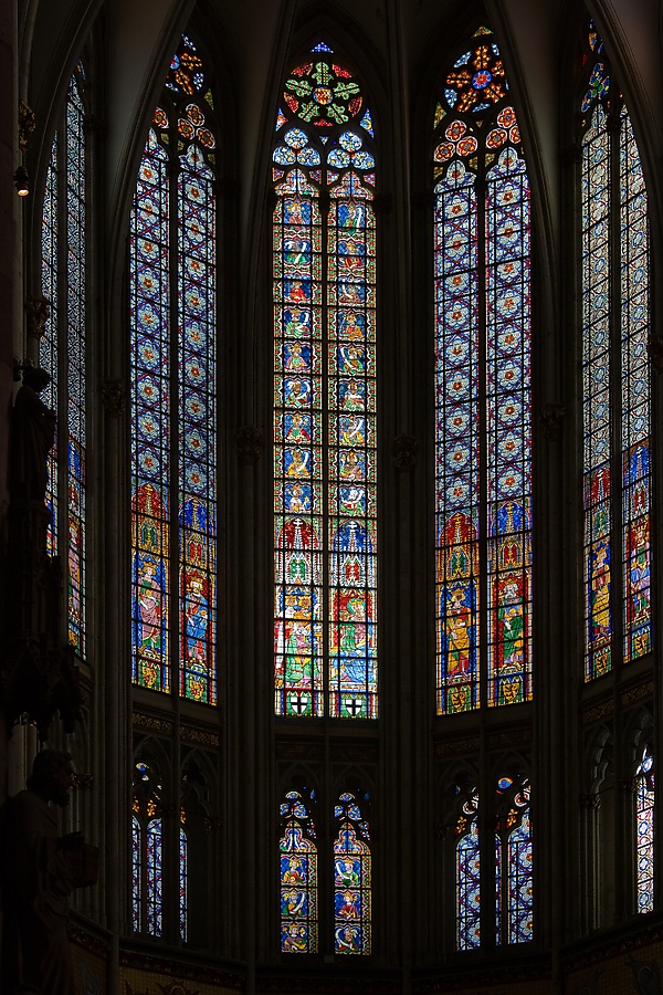 Пять продольных нефов пересекает трёхнефный трансепт. Над полукружием капелл деамбулатория, образующих малые апсиды (апсидиолы), возвышаются отдельные контрфорсы, переходящие вверху в арочный свод с множеством вершин. Между ними хорошо просматриваются окна хора с изящным ажурным орнаментом и богато украшенными фронтонами. Колонны главного нефа имеют высоту 43,5 м. В пяти северных окнах апсидиол сохранились старинные витражи с изображениями на библейские сюжеты, так называемые «библейские окна»[2].