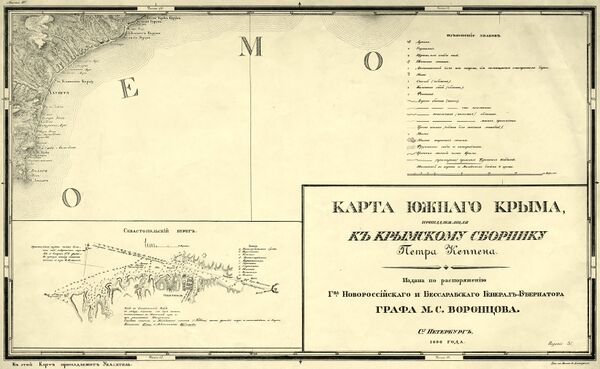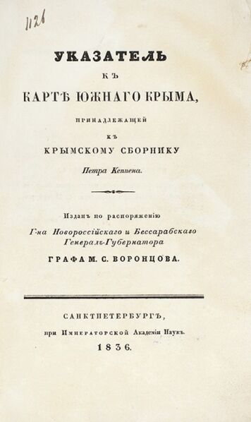 - Кёппен П. И. Указатель к карте Южного Крыма, принадлежащей к Крымскому сборнику Петра Кеппена / изд. По распоряжению г-на Новороссийского и Бессарабского генерал-губернатора графа М.С. Воронцова. СПб.: В Имп. Академии наук, 1836. 70 с., 1 л. карт. 22,5×14,5 см.