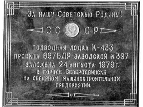 2 февраля 1977 года зачислен в списки кораблей ВМФ как К-433. 25 июля 1977 года отнесен к подклассу РПКСН (ракетный подводный крейсер стратегического назначения). Заложен на стапелях МП «Севмаш» (цех № 50) в Северодвинске 24 августа 1979 года, заводской номер 397. Первый экипаж сформирован на базе 8-й и 25-й дивизий 2-й Флотилии ПЛ ТОФ в августе 1978 года, командиром назначен капитан 2-го ранга Гладышев Юрий Петрович. Входил в состав 331 ОБрСРПЛ (отдельная бригада строящихся и ремонтирующихся подводных лодок) Северного флота ВМФ СССР.