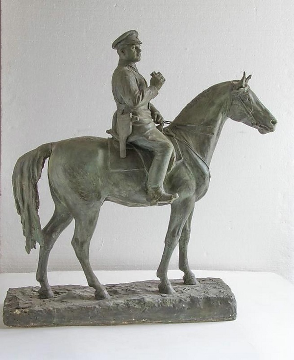 Скульптура расположена на прямоугольном основании. Конь изображён в шаге с приподнятой головой при повороте вправо. На коне сидит советский военачальник К.В. Ворошилов. Линия позы подчёркивается правильным расположением ног в стременах. Левая рука удерживает поводья, а в согнутой у груди правой руке изображён бинокль. На фигуре имеется фуражка и гимнастерка, подпоясанные ремнём, а также портупея. На воротнике предусмотрены прямоугольные петлицы. С правой стороны располагается крупная кобура, а с левой – шашка. Скульптура затонирована под патинированную бронзу. Размеры объекта составляют 73×69×22 см.