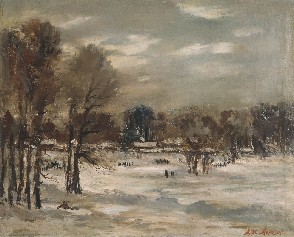 На картине изображён пасмурный зимний пейзаж: на переднем плане и в глубине видна земля, покрытая потемневшим снегом. Слева расположены две группы деревьев, а на среднем плане справа также выделяются группы деревьев, формируя сбалансированную композицию. Вдали, на фоне высоких деревьев, виднеются домики с заснеженными крышами. Небо представлено в серых тонах с небольшими белыми облаками. Работа выполнена в коричнево-серой цветовой гамме, подчёркивающей атмосферу зимнего дня.