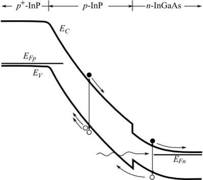 - Арсенид галлия-индия (InGaAs) имеет высокий коэффициент поглощения на длинах волн, обычно используемых в волоконно-оптических линиях связи, поэтому достаточно даже микронных слоёв InGaAs для полного поглощения излучения[4].