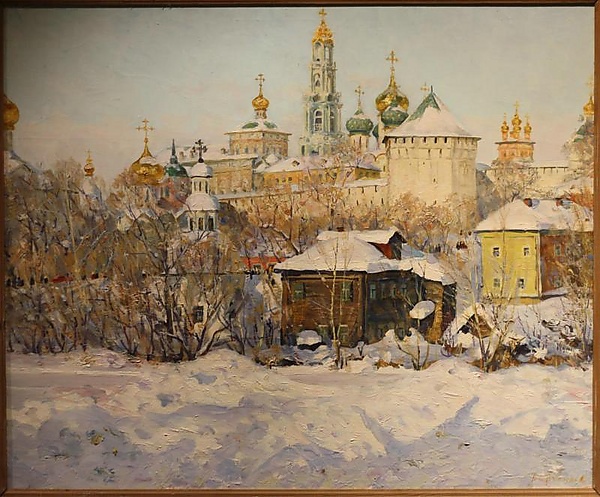 На картине изображён зимний вид на Троице-Сергиеву лавру с Блинной горы. На переднем плане располагается широкое заснеженное поле и коричнево-жёлтый двухэтажный дом с заснеженной крышей, слева от которого, среди деревьев, видны Пятницкий колодец, Пятницкая и Введенская церкви. Архитектурные памятники лавры выполнены в бело-розовых и зеленовато-голубых оттенках с золотисто-жёлтыми куполами на фоне бледно-голубого неба, что придаёт работе особую выразительность цветовой гаммы.