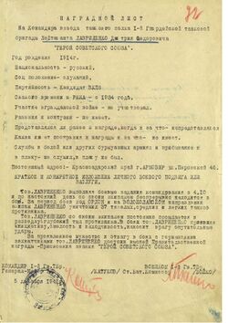 5 декабря 1941 года гвардии старший лейтенант Лавриненко был представлен к званию Героя Советского Союза. В наградном листе отмечалось: «…выполняя боевые задания командования с 4 октября и по настоящее время, беспрерывно находился в бою. За период боёв под Орлом и на Волоколамском направлении экипаж Лавриненко уничтожил 37 тяжёлых, средних и лёгких танков противника…»[52]