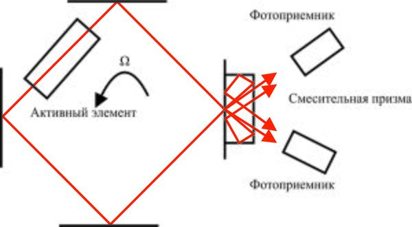 При работе из лазера выходит два луча, распространяющихся в противоположных направлениях по замкнутому контуру. Лучи сводятся вместе, в результате получается бегущая интерференционная картина (ИК), пространственный период которой обычно около 1 мм. Направление движения, или знак приращения фазы ИК, определяется фотоприёмником с двумя площадками, расстояние между которыми равно 1/4 периода ИК. Приращение фазы на пропорционально углу поворота ЛГ и обычно составляет от 0,1—0,2′′ для больших ЛГ с периметром около 4 м до 10—20′′ для малых периметров (около 4 см). Подсчитывая количество полос ИК или их долей (от 1/2 до 1/8), проходящих по фотоприёмнику за время накопления (от 1 мс до 1000 с), можно определить угол поворота ЛГ вокруг оси, перпендикулярной к плоскости хода лучей за время накопления, а, следовательно, и среднюю угловую скорость за это время.