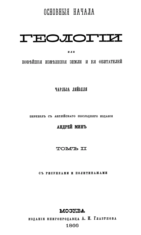 - Лайель Ч. Основные начала геологии или новейшие изменения земли и её обитателей / Пер. с англ. А. Мин: В 2 т. — М.: изд. А. Глазунова, 1866. Т. 2. — 462 с.