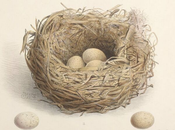 Чашеобразное гнездо птицы строили под травянистым укрытием или в кустарнике, в крайнем случае сами маскировали своё гнездо. Доступ к гнезду был непрямой, очевидно, чтобы защитить тем самым от разорителей. Яйца были длиной 3,1 см и шириной 2,1 см. Высиживание происходило с мая по июнь. В кладке было в среднем 3 яйца[2][3].