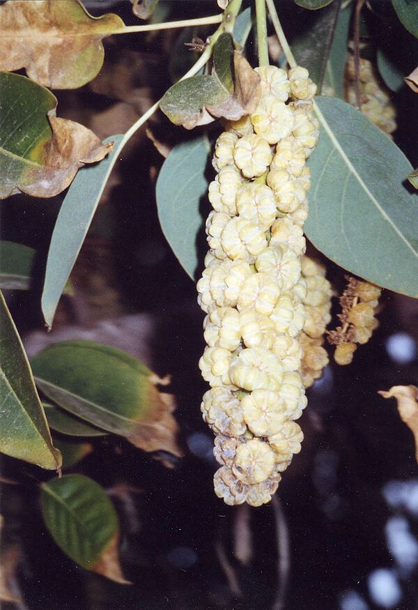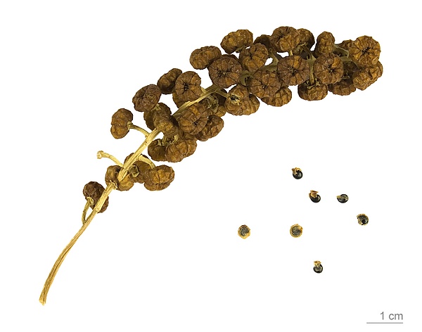 В отличие от большинства видов рода, в висячих, иногда также прямостоячих, плотных и конечных соцветиях много цветов. Радиально симметричные, пятикратные и короткостебельные, очень мелкие цветки с одной шейкой и простым околоцветником. Образуются очень маленькие опоры и предварительные листья. Всего пять зеленовато-беловатых, 2—3 миллиметра длиной, широкояйцевидных прицветников. Мужские цветки содержат от 20 до 30 выступающих тычинок и пестик. Женские цветки минимально меньше, у них шаровидная, верхняя и многокамерная завязь с 6—7 короткими стилетами и 10 стаминодиями. Каждый из них представляет собой диск.