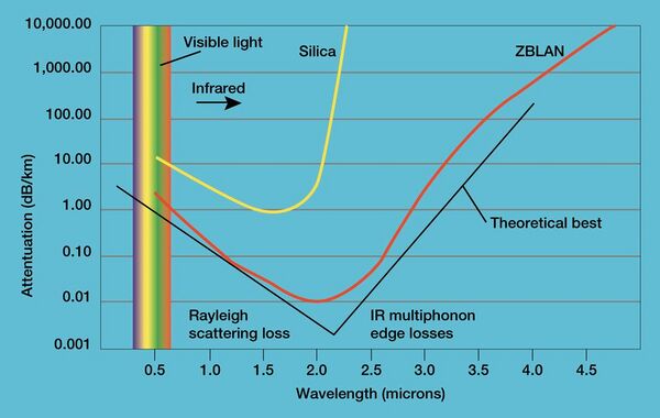 - Фторид лантана — важный компонент люминофоров. В смеси с фторидом европия он используется в кристаллической мембране ионоселективных электродов[29]. Он также входит в состав стекла ZBLAN. Оно обладает улучшенным коэффициентом пропускания в инфракрасном диапазоне и поэтому применяется в волоконной оптике[30].