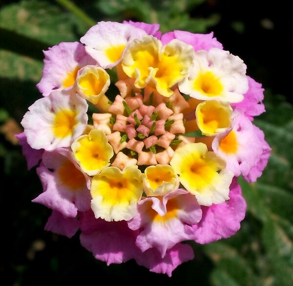 Цветки мелкие многочисленные, собраны в щитковые соцветия на длинном цветоносе. Они могут быть белого, жёлтого, красного, розового, оранжевого, фиолетового и других цветов. Их окраска меняется в зависимости от степени созревания[5]. Опыляются преимущественно бабочками, также нектаром лантаны сводчатой могут питаться разнообразные пчелы[6].