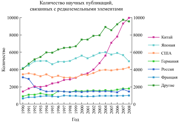 Общее количество научных работ, зарегистрированных в Химической реферативной службе (англ. Chemical Abstracts Service), в 1990 г. составило приблизительно 490 000, из которых затрагивали тему изучения РЗЭ 18 000; в 2007 г. общее количество приблизилось к 1 000 000, из которых примерно 3 % касалось РЗЭ. Больше всего материалов публиковалось на темы, связанные с оксидами группы (до 5000 статей, 2008 г.), далее — спектроскопией (более 1400 статей, 2008 г.), магнетизмом (до 1400, 2006 г.), магнитами (так же), катализом и катализаторами (до 1400, 2008 г.)[107].