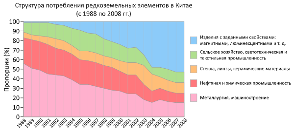 Области потребления РЗЭ в 1975 г.[212] Металлургия (45 %) Катализаторы, химикалии (36 %) Оптические стёкла, керамика (17 %) Люминофоры, электроника (2 %) |