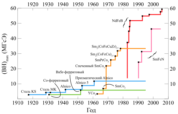 История изучения постоянных магнитов на основе редкоземельных элементов берёт своё начало с 1959 г., в котором была опубликована работа по изучению сплава GdCo5. Впоследствии было опубликовано множество работ, касающихся способов получения, изучения, улучшения свойств YCo5, SmCo5 и примесей к нему[227][К 25]. К середине 1980-х гг. ученые получили три наиболее полезных сплава: SmCo5, Sm2Co17 и Nd2Fe14B. Каждый из них намного превосходит по своим полезным свойствам предыдущие типы магнитов, а лучшие — в десять раз сильнее альнико или ферритовых сплавов[228][229]. По максимальному показателю энергии продукта магниты можно расположить в следующем порядке: Nd2Fe14B (до 56,7 МГсЭ) > Sm2Co17 (22—32) > SmCo5 (22) > Альнико (до 11) > Ферриты (до 6)[230][К 26].
