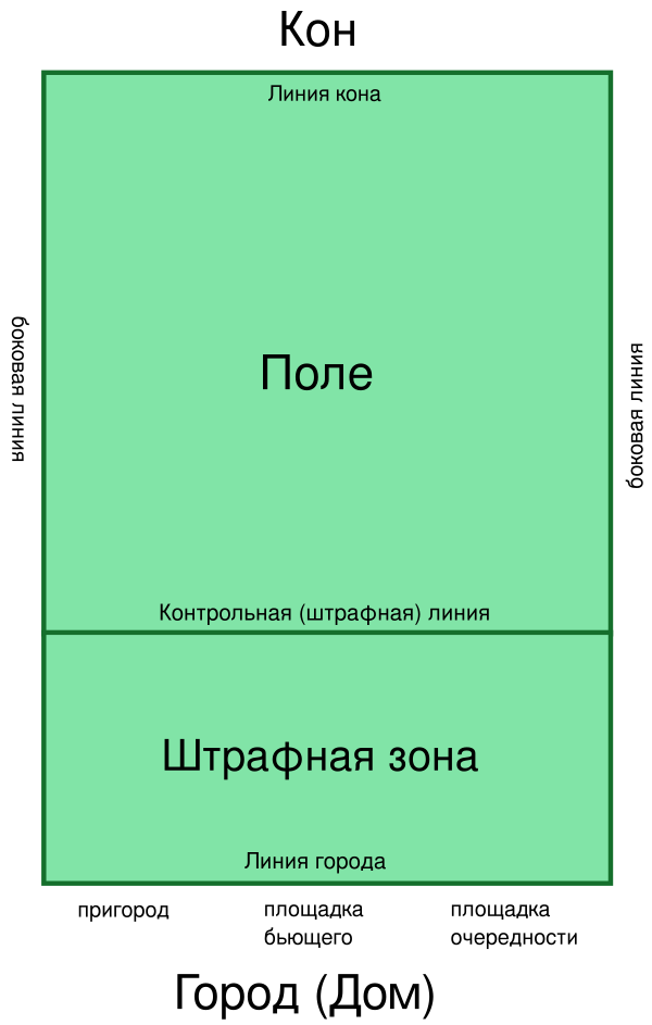 Игра проходит на прямоугольной игровой площадке размером 40—55 м. в длину и 25—40 м. в ширину. С одной стороны площадки находится город (дом), откуда мяч вводится в игру ударом биты, с другой стороны — кон. Между домом и коном находится поле. По бокам поле ограничено боковыми линиями. В 10 метрах от линии дома в поле проводится контрольная (штрафная) линия. Между контрольной линией и линией дома находится штрафная зона. Штрафная зона нужна для определения правильности удара. Если мяч перелетел контрольную линию по воздуху (не коснулся штрафной зоны), то удар засчитывается, если соблюдены другие условия (см. раздел «Ввод мяча в игру»).