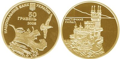 28 мая 2008 года Национальный банк Украины ввёл в оборот золотую и серебряную монеты «Ласточкино гнездо» номиналом 50 и 10 гривен соответственно. Монеты вышли в серии «Памятки архитектуры Украины». Золотая монета отчеканена из золота 900-й пробы и имеет вес 15,55 г. Тираж — 4000 шт[39]. Серебряная отчеканена из серебра 925-й пробы и имеет вес 31,1 г. Тираж — 5000 шт[40].