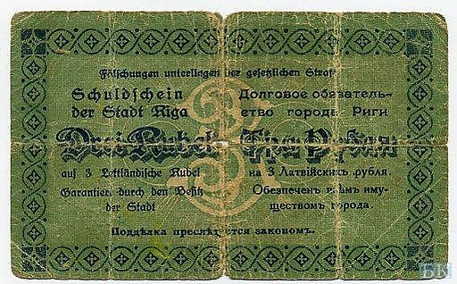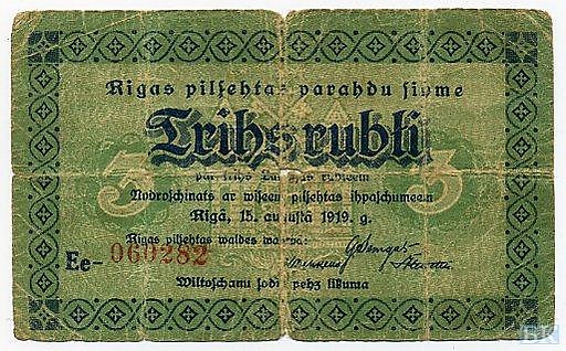 По причине нехватки мелких денежных купюр правительство Латвии 19 февраля 1919 года позволило городу Риге выпустить разменные знаки достоинством в 1, 3, 5 и 10 рублей на общую сумму более 20 млн рублей. Все купюры были с гербом: молот и коса на красной звезде, с надписью по-латышски «Пролетарии всех стран, соединяйтесь». При изготовлении использовалась бумага германского производства.[1][2]