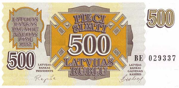 7 мая 1992 года новая валюта вышла в обращение. Были отпечатаны банкноты достоинством в 1, 5, 20, 50, 200 и 500 рублей, а несколько позже и банкноты достоинством в 2 и 10 рублей. Обмен советских рублей на латвийские происходил в соотношении один к одному. Первое время латвийский рубль имел проблемы в связи с нежеланием рынка принимать его. После введения дополнительных административных мер за отказ принимать денежные знаки банка Латвии (от штрафа до административного ареста)[9] ситуация изменилась, и латвийский рубль постепенно вытеснил советский.