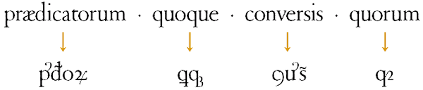 Во времена Средневековья в латинском письме часто употребляемые префиксы, суффиксы и даже корни слов сокращались с помощью лигатур и специальных знаков, некоторые из которых используются и сегодня. Например, символы @ и & образованы из латинских слов ad («к») и et («и»).