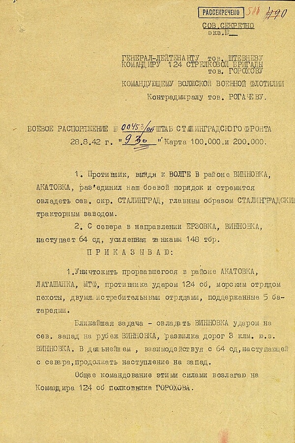 В ночь на 1 ноября штаб Донского фронта отдал командующему 16-й воздушной армией приказ: «Сосед слева выслал десант на зап. берег Волги и занял сев. часть Латошинка. Наши левофланговые части с утра 1.11.1942 г. наступают с рубежа выс. 141,2, выс. 129,6 , сев. окр. Томилин в южном направлении. Комфронта приказал: В 7.30 1.11.1942 г. нанести сильный удар штурмовиками по боевым порядкам противника в районе выс. 109,3, 111,2, МТФ (3 км ю.-з. выс. 129,6), б. Сухая Метка (южная), верховье б. Котлован (2 км зап. Винновка). В дальнейшем иметь три шестерки штурмовиков в стартовой готовности № 2 для действий по вызову. Истребителями прикрыть штурмовиков в дальнейшем по вызову. Исполнение донести…»[43].