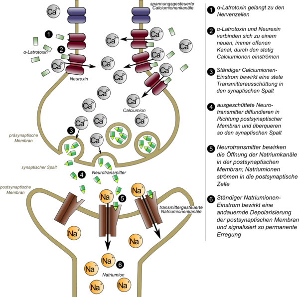 Яд быстро распространяется по организму и вызывает высвобождение нейромедиаторов ацетилхолина, норадреналина и ГАМК. Высвобождение этих нейромедиаторов приводит к клинической картине отравления.