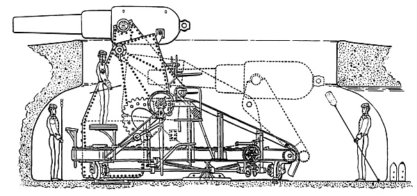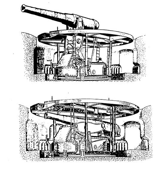 С целью устранить указанные недостатки, устроены скрывающиеся лафеты; на них орудие остается видимым в течение времени, необходимого для наводки и производства выстрела; от выстрела орудие снижается и в таком положении заряжается.
