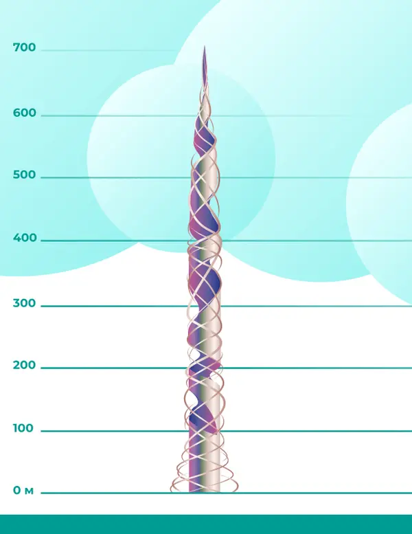 Согласно концепции, внешняя оболочка здания состоит из закрученных колонн, внутри которых находится тело здания. Здание будет содержать 8 секций по 16 этажей с трёхэтажными атриумами. Всего в здании будут располагаться 150 этажей, самый высокий будет располагаться на высоте 590 метров. Полезная площадь здания составит 220 000 м².