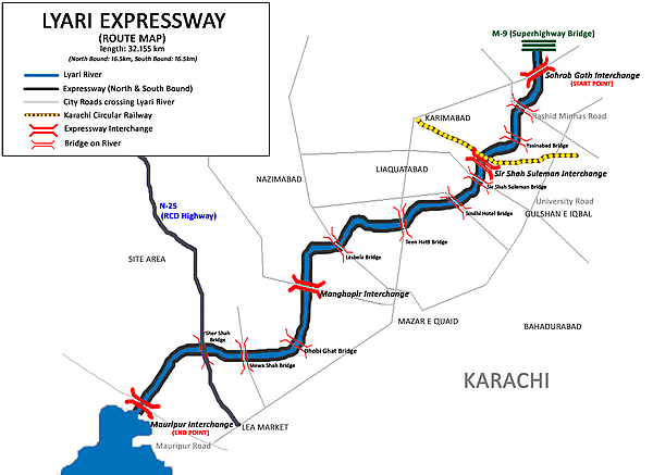 Однако реализация проекта магистрали длиной в 16,5 километра началась в 2002 году без какого-либо общественного консенсуса, в результате множество построек были снесены под предлогом незаконности их возведения. Около 200 000 семей были переселены в новые районы и пригороды Карачи.[5]. Новая трасса стала альтернативой существующей к северу объездной трассы и помогла немного разгрузить центр.