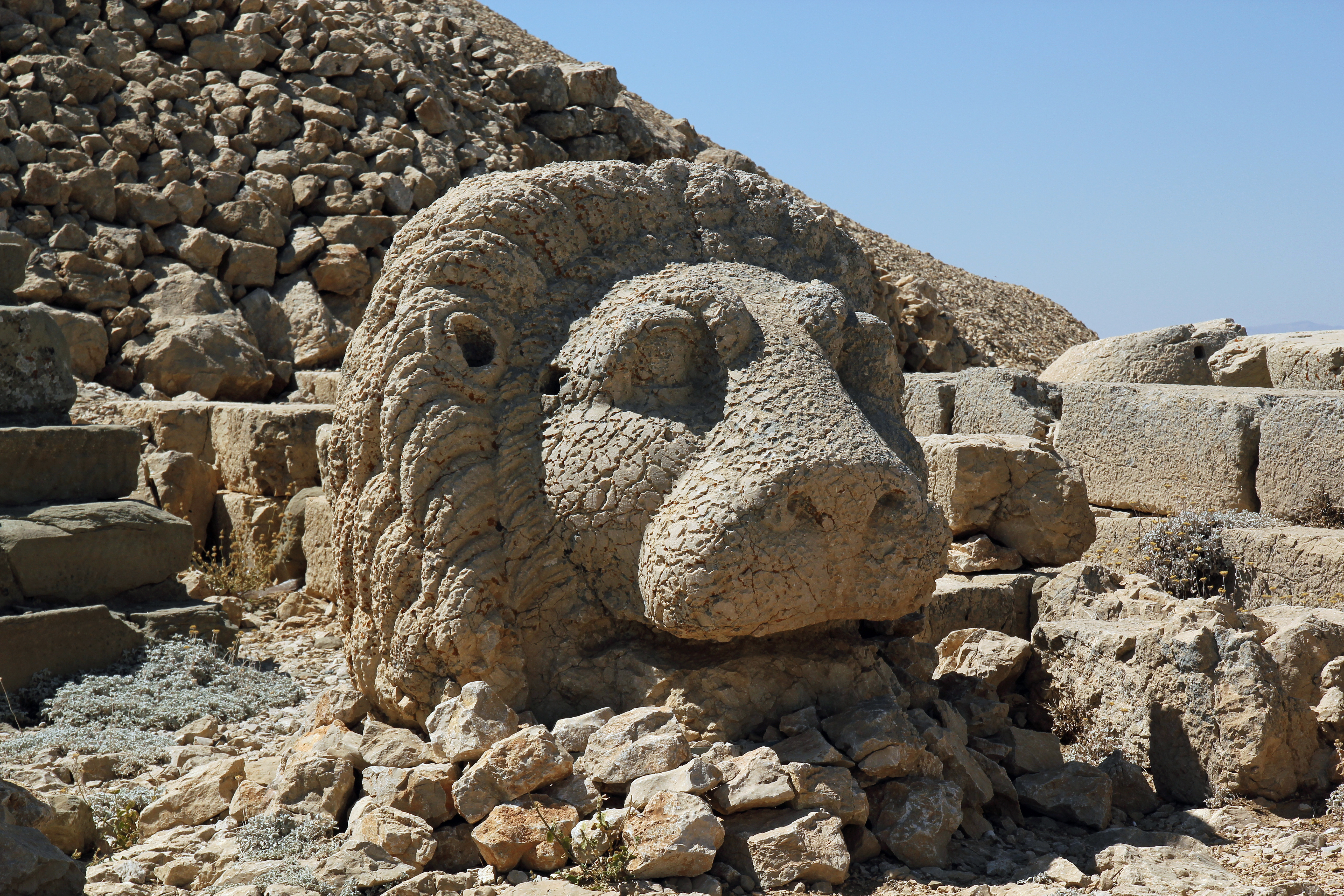 | Лев на декоративной панели из дворца Дария I. Персидская империя (550 — 330 до н. э.) | Скульптура Льва у гробницы армянского царя Коммагены, Антиоха I (I век до н. э.). Немрут-Даг, Турция |