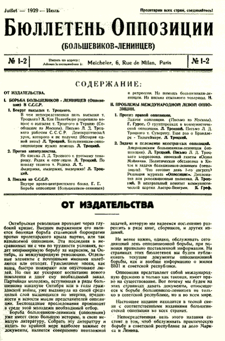 С июля 1929 года в Париже издавался «Бюллетень оппозиции (большевиков-ленинцев)». В Бюллетене печатались материалы, анализирующие положение в большевистской партии, причины поражения Левой оппозиции, давалась оценка событий, происходящих в Советском Союзе[27]. Авторами публикаций, кроме Троцкого и его сына Л. Л. Седова, были И. К. Дашковский, Е. А. Преображенский, К. Б. Радек, Х. Г. Раковский, И. Т. Смилга, Л. С. Сосновский, А. Цилига, К. Цинцадзе и многие другие менее известные оппозиционеры. В журнале печаталось также значительное количество анонимных материалов — свидетельства из СССР, рассказы выезжавших за рубеж по служебным делам тайных сторонников оппозиции и письма от разбросанных по разным концам страны оппозиционеров, которые они привозили, публиковались без указания авторства по соображениям конспирации[28].