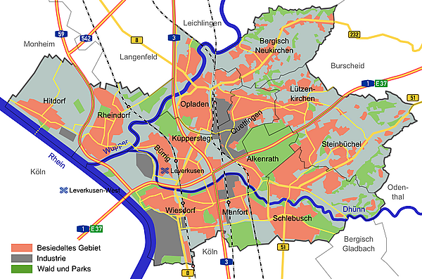 Город расположен на северо-восточной границе с Кёльном и относится к Рейнско-Рурскому столичному региону. Имея 163,8 тысяч жителей (по данным на конец 2018 года), этот город является один из самых маленьких городов в списке крупных городов земли. В Леверкузене находится штаб-квартира фармацевтической компании «Байер» и одноимённый футбольный клуб. Город был основан в 1930 году в результате слияния города Висдорф с коммунами Шлебуш, Штайнбюхель и Райндорф[5].