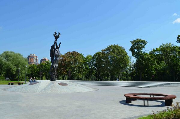Парк площадью 51 гектар располагается вокруг Фестивальных прудов по адресу: Флотская ул., д. 1а. Он был открыт в 1957 году ко всемирному фестивалю молодежи и студентов, который тогда проходил в Москве, и получил название в честь дружбы народов. Архитекторами парка выступили юные выпускники МАрхИ Валентин Иванов, Галина Ежова и Анатолий Савин[36]. Для строительства парка также рассматривались территории около современной Профсоюзной улицы и Поклонная гора, но рельефный ландшафт затопленного кирпичного карьера у Химкинского водохранилища показался архитекторам более интересным местом для новой зоны отдыха. На церемонии открытия парка присутствовало более пяти тысяч гостей фестиваля и членов иностранных делегаций, которые посадили здесь вместе деревья в знак дружбы и сотрудничества. В 1985 году в парке была обустроена площадь с амфитеатром и памятником «Дружба континентов»[37]. Памятник изображает две фигуры — юноши и девушки, которые держат в руках ветви оливы и выпускают голубей — посланников мира. На постаменте памятника установлены медальоны с изображением голубков, каждый из которых символизирует пять континентов: Европу, Азию, Африку, Америку и Австралию. Медальоны расположены по кругу в форме цветка — пятилепестковой ромашки, которая была эмблемой фестиваля 1957 года. На западной территории парка, граничащей с Ленинградским шоссе, находятся аллеи с памятниками: скульптурами «Хлеб» и «Плодородие» по эскизам Веры Мухиной, памятником испанскому писателю Мигелю де Сервантесу, памятной стелой подвигу советского народа в Великой Отечественной Войне (подарена Данией), монументом финского скульптора Антти Неувонена «Дети Мира», памятником венгеро-советской дружбе и другими монументами.