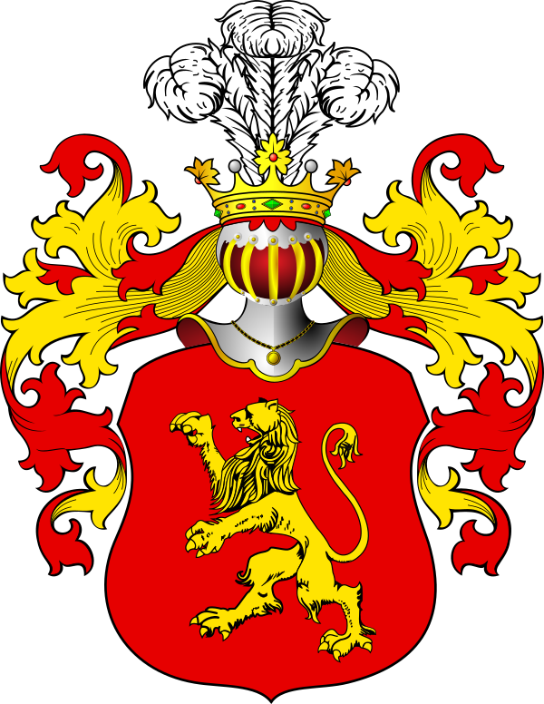 В красном поле восстающий золотой лев. Шлем увенчан дворянской короной и тремя страусовыми перьями. Намёт на щите красный и подложен золотом.