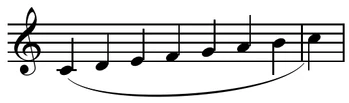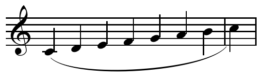 - Изогнутая линия (лигатура), обычно размещаемая над нотами[1] при нисходящих штилях и под нотами при восходящих. В случае целых нот без штилей направление лигатуры определяется их положением на нотном стане. Если штиль у разных нот направлен в разные стороны, лигатура всегда изгибается вверх.